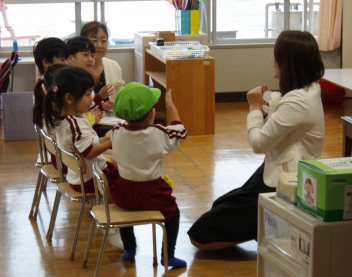 花川小学校では、一年生の皆さんと『じゃんけん列車』や『フルーツバスケット』をして、遊びました