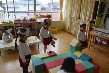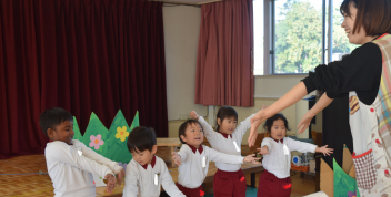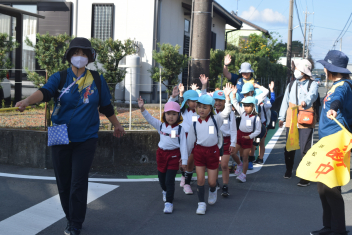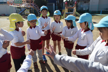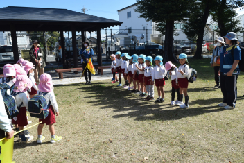 【年中・年長】さくら組とゆり組が、手をつないで万斛庄屋公園まで園外保育に行ってきました。「右、左、後ろ、前、よし