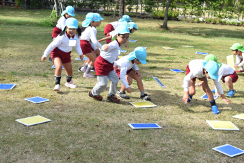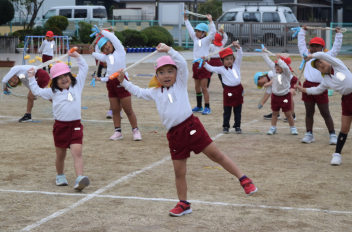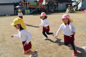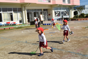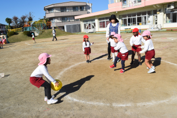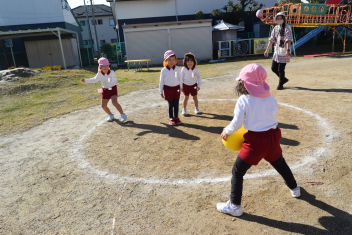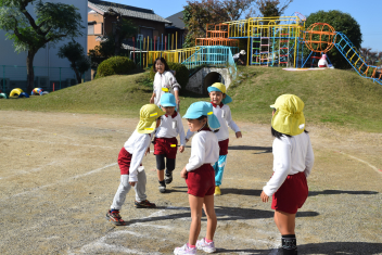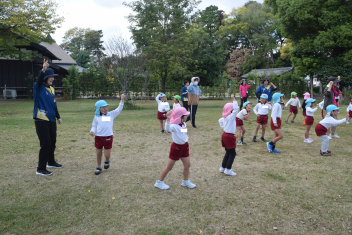 万斛庄屋公園の管理者の方に挨拶をした後、みんなで「猛獣狩り」「カードめくり」「しっぽとり」等たくさん体を動かして遊びました