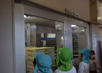 給食室ものぞいてみたり・・「いい匂いがするね」「パンがいっぱいあるね」子供たちは「給食」が楽しみなようですsad