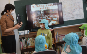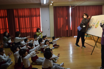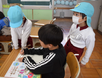 最後に「幼稚園にはなくて、小学校にあるものは?」とクイズを出題すると「机と椅子。鉛筆や、勉強の本もあった」と元気に答えていましたね。小学校に対して憧れや楽しい気持ちがもてるよう、年数回、近隣の小学校との交流を大切にしています。次回は2月に5年生との交流も計画しています。楽しみですね