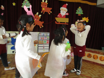 今日はクリスマス会です「雪だるまさんとツリー」のパネルシアターを見たり、「あわてんぼうのサンタクロース」の歌を元気よく歌ったり・・