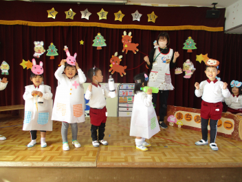 年中踊り「ロックン・オムレツ」では、かわいいコックさんになりきって、踊りました。おいしいオムレツ、できたかな