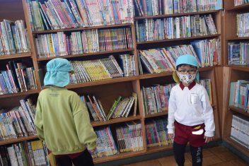 「小学校って、部屋がいっぱいあるね」「ここは、図書室なんだって」「本がいっぱい」「僕の好きな図鑑もある」たくさんの部屋や本の多さに驚いたり・・・