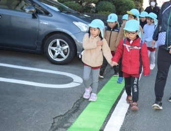今日は年長さんが中郡小学校に出掛けました「これはスクールゾーン、歩くところだね。」「細道も車の確認をする。」「手をあげて、横断歩道わたろうね。」等、先生や友達と交通ルールを確認しながら、安全に歩いていきました。