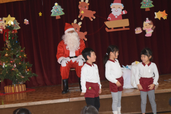 「嬉しいね」「本当に来てくれたね」「お礼にみんなで踊ろうよ」異学年でペアになり、ジングルベルを踊りました。サンタクロースさんも、手拍子をしながら喜んでくれましたねsad