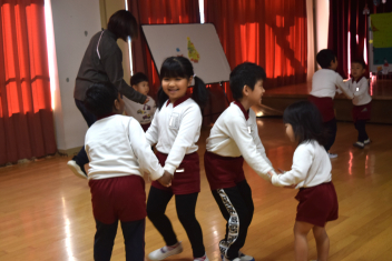 【年長】遊戯室では、年長さんの元気な歌声が聞こえてきました。歌が好きな年長さん。歌詞に合わせて、振り付けも自分たちで考えていましたsad