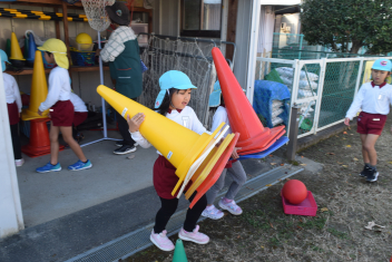 年長さんは、器具庫の掃除です。今まで使ったボール、巧技台、コーンを運び出して、整頓します。ピカピカになると気持ちがいいねsad