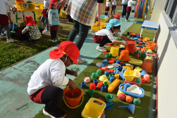 おもちゃは、きれいに洗ったら・・・種類ごとに並べておこう。日向においておけば、すぐに乾くよねsad「砂場遊びも楽しかったね」年少さんは、たくさんの玩具を洗っていました