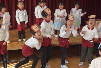 今日は「生活発表会」ですオープニングは、全園児で「園歌」と「楽しいね」を歌いました。緊張している子も多かったですが、元気いっぱい歌いました。