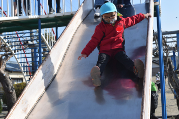 校庭にも遊びに行きました。総合遊具では「大きな滑り台だね」「登り棒もあったよ