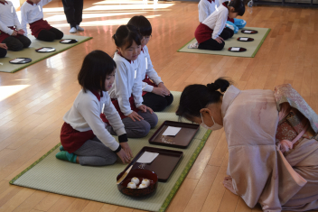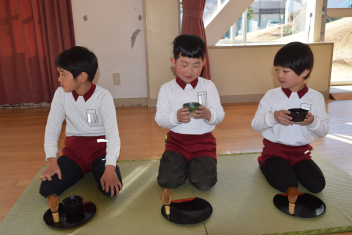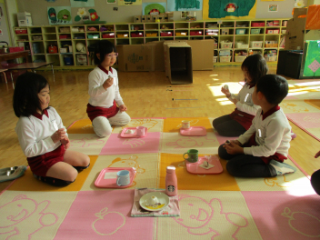 その頃、年中さんも保育室で「お茶会ごっこ」をしましたゴザの上で正座をしたり、お辞儀をしたり・・おしゃべりも楽しそうでしたsad