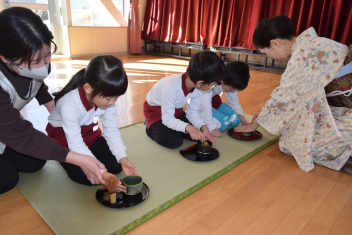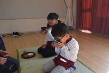 次に茶せんをつかって、お茶をたてます。「シャカシャカ・・」やさしい音が響きます。「難しいね」初めての体験で、緊張していましたが、どの子も真剣に行っていましたlaugh