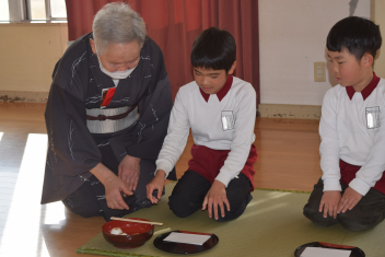 今年度も自分でつくったお茶碗をつかって「お茶会」を行いました。講師の先生から、お辞儀の仕方、お茶のたて方、お菓子の食べ方など、丁寧に教えていただきました。