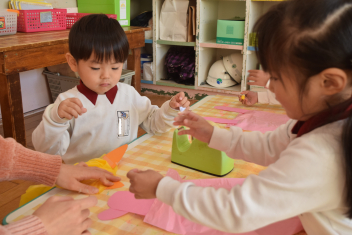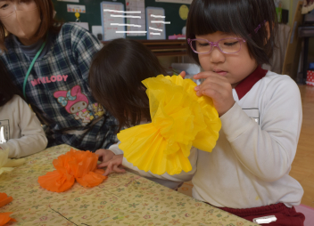 【年少】今日はカラーポリ袋に耳をつけて・・「何をつくっているのかな」「先生、ここ、持ってて」少し、先生に手伝ってもらいながら、自分でセロハンテープをつけようとする年少さん。「自分でできたsad」という体験が大切ですね。