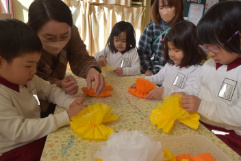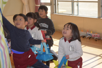 年中さんは「いわしをつくったから、職員室の入り口に貼っておいて」「ゆらゆらするように・・」