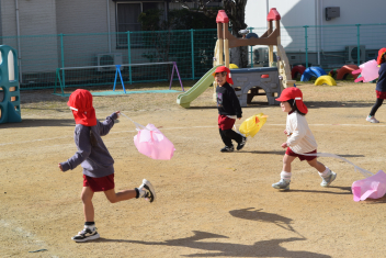ウサギと、ネコの凧が完成しました風が吹く中、元気いっぱい園庭を走っています。友達と並んで楽しそうですねsad