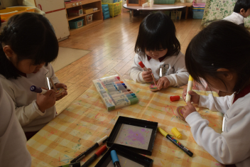 【年少】今日は、手回しごまに色塗りをする年少さん。「私、赤で塗る」「僕は青がいい」「次、ペン貸してsad」友達とやりとりをしながら、楽しく色塗りをしていますsad