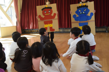 【年中】昼食前に、鬼に変身した年中さんが先生を鬼が鬼ヶ島に連れて行こうとしていますどうやら、仲間にしようとしているようですね豆まき会にむけて鬼のお面や衣装、的あて、新聞豆、つのこうばこ等、学年に応じて取り組んでいますsad