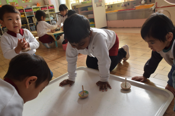 【年少】駒がまわっている様子を不思議そうにずっと眺めていましたsad駒の芯にかざり飾りをのせて、回すと色が変わったり、回る速さが変わったり・・年少さんなりにいろいろ試していましたねsad