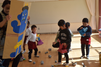 「もう来ないように、豆まきをしよう」「鬼は外」新聞紙で作った、豆をみんなで投げましたsad「豆、これじゃ、足りないかも・・」「もっと作らないと」自分たちで気付き、準備をする子供たち。