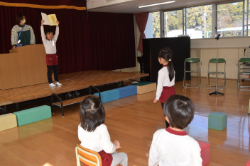 年少さんや年中さんは、イラストクイズ「いわしはどれでしょう」「柊はどれでしょう」積極的に手をあげる子供たち。豆まきの由来について学年ごとの工夫がみられました。