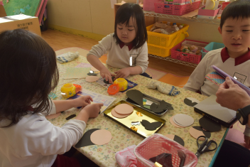 【年長】自分の心の中にいる鬼をイメージしながら、丁寧に製作していました。いろいろな形に切ったり、貼ったり・・大きさを比べたり・・工夫している部分がたくさん見られましたねsad