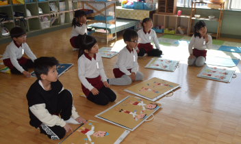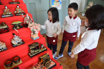 昼食後には、年長さんが雛人形の飾りつけをしていました「これは、三人官女だよね」「刀は、誰が持ってるの」「どの順番で置くの」初めての経験にため、みんなで相談しながら仲良く飾り付け。素敵な雛壇の出来上がりです