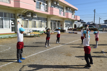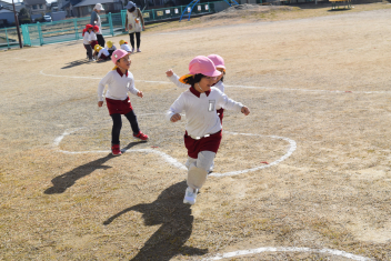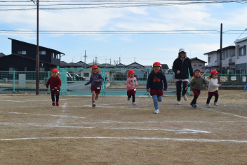 【年中】曲に合わせて、走り出す子供たち。たくさん走ると体も温まり、元気に遊ぶことができるねsad「鬼ごっこやろうwink」「長縄やりたい