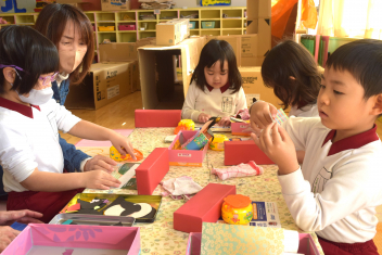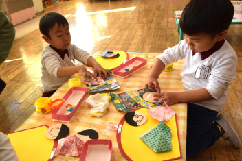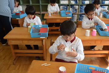 【年長】小学校の椅子、机を使ってひな人形を製作中紙コップに折り紙を貼る作業は、少し難しいですが、ゆっくり丁寧に・・材料もたくさんあるため、1人1人カゴに入れてありましたsad