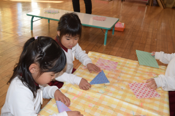 【年少】折り紙(和紙)を三角に折って・・おひな様の着物をつくっている年少さん。両手を使って、角と角を合わせて・・難しいけれど、頑張って折っていましたね