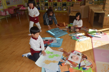 【年長】今までの絵画や製作物をみんなで見ながら、幼稚園の思い出を振り返っていますsad「遠足、楽しかったねsad」「僕は、運動会、リレー頑張ったよ」「発表会の劇、面白かったね」等・・子供たちの1年の成長を感じます