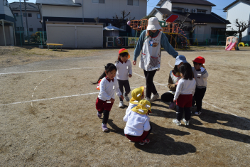 【年少】「よーい、どん」先生や友達とかけっこです。「先生、もう1回やろう」「次は、負けないよ~」体が温まってきたら、次は「かくれんぼしようよ」「いいねいいね~