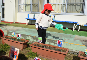 【年少】暖かくなってきたから、チュウリップの芽が少しずつ出てきましたsad「大きくな~れ