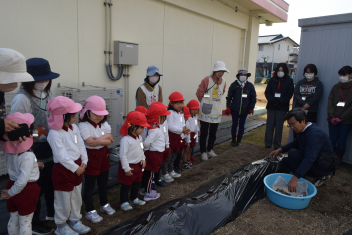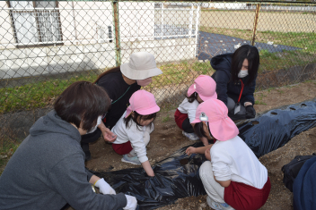 畑ボランティアのお母さんたちも手伝ってくれて、やさしく植えることができましたねsadそ~っと土をかけて・・「大きくなーれ