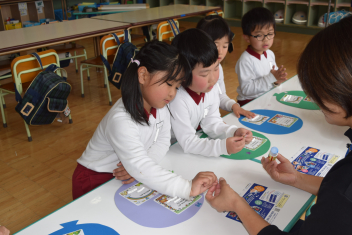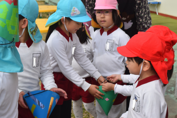 年長さんは、卒園式用のコサージュ作りです。講師の先生のお話をよく聞いて、丁寧に・・「お母さんの好きな色の花を選んだよ」「卒園式に付けるの、楽しみだねsad」親子製作を通して、幼稚園の思い出がまた1つ増えましたね