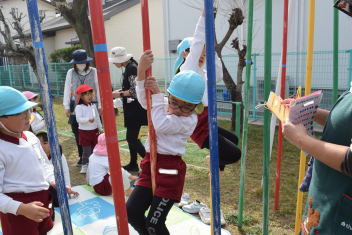 【年長】「僕、登り棒、やってみる。」チャレンジカードを見ながら、自分なりにめあてをもって取り組んでいました。その傍には友達が「頑張って」と応援してくれましたsad