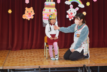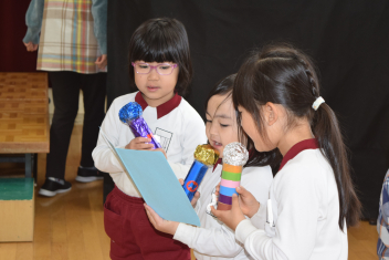 今日は誕生会です。司会の引継ぎをしながら「こうやって言うよ」と、優しく教えてくれる年長さん。そのおかげで「今から誕生会を始めます」年中さんは元気に司会をすることができました。