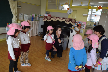 • 今日は有玉幼稚園の年中さんと交流保育でした。「タクシーできたよ」とても楽しみにしていた年中さんは、待ちきれなくて玄関まで迎えにいきました。「今日は、一緒に遊ぼうね