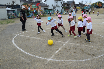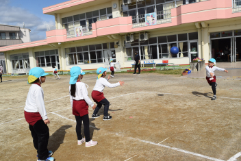 いつもより大勢で転がしドッジボールをすると、より楽しさも倍です。「また、遊びに来てほしいsad」「有玉幼稚園も行ってみたいねsad