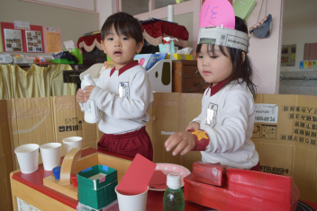 【年少】先日、年長さんの31アイス屋さんに招待された経験から、年少さんなりのアイス屋さんがオープンしましたsadみどり色のジュースは「アロエですwink」「アイスに苺もトッピングしますか」年長さんへのあこがれの気持ちが伺えますねsad