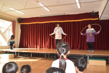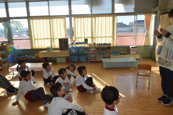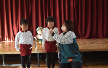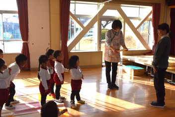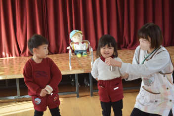 楽しい冬休みを過ごすために、先生たちが劇で約束を伝えます。「寒くても、外で体を動かして遊ぼう」「ポカポカしてくるねlaugh」「できなくても、繰り返しやってみよう