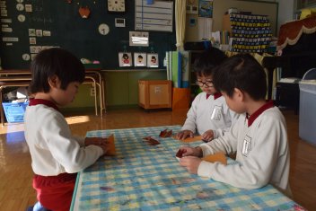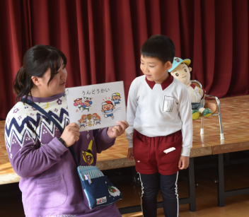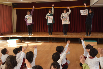 最後に「幼稚園にはなくて、小学校にあるものは?」とクイズを出題すると「机と椅子。鉛筆や、勉強の本もあった」と元気に答えていましたね。小学校に対して憧れや楽しい気持ちがもてるよう、年数回、近隣の小学校との交流を大切にしています。次回は2月に5年生との交流も計画しています。楽しみですね