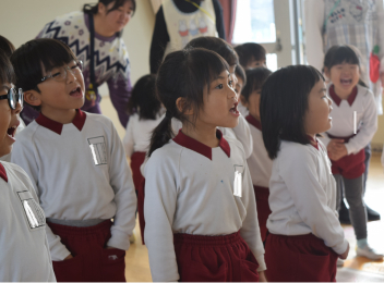 フィナーレは、年長さんによる歌「世界中の子供たちが」を歌いながら手話で行いました。手話も思いを伝える大切な手段の1つであることを伝え、心を込めて演じました