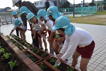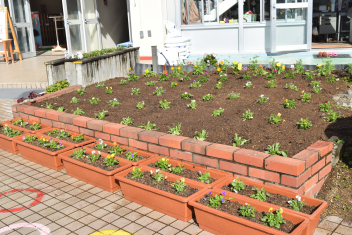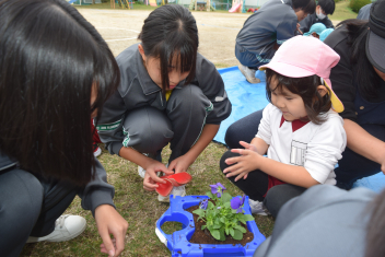 今日は「花いっぱい運動」でした。年長さんが、プランターにビオラを植えます。「優しく、土をかけてね」「どんな色の花が咲くかな