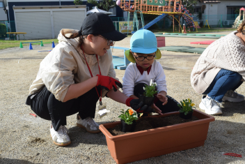 今日は浜松東高校のお兄さんお姉さんとの交流です。お互いに自己紹介をして、「今日は一緒に遊ぼうねsad」年長、年中さんは一鉢栽培(パンジー、ビオラ)を一緒に植えてもらいました