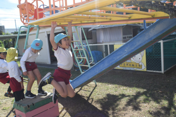 【年長】年長さんは、今日からチャレンジカードを持って遊具に挑戦ですsadタイヤ跳び、鉄棒、雲梯、縄跳び・・・「やってみたい」「やってみよう」の気持ちを大切にしています