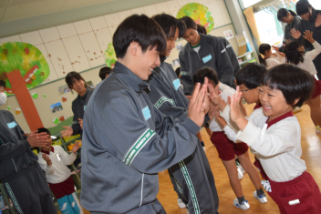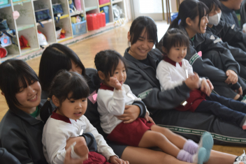 膝の上にのせてもらって・・「バスごっこ」右に傾きま~す、でこぼこ道で~す「初めまして」のあいさつは緊張している子が多かったですが、交流終了時には、みんなニコニコ、「まだ、帰らないで」「もっと遊んでほしい」楽しかったことが伺えますwinkこのように地域の高校との交流も大切な経験ですね