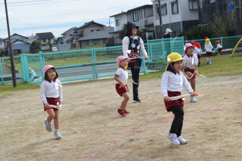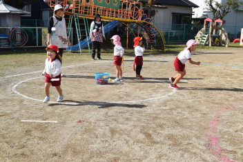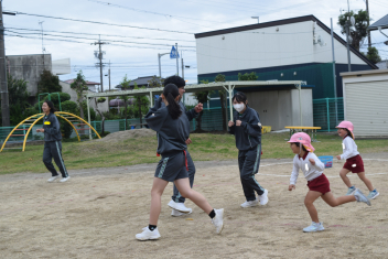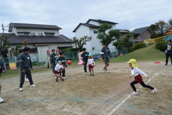 【異年齢】昨日、高校生のお兄さん達と遊んだ「しっぽとり」を年少さん、年中さんが遊んでいます。「しっぽ取られても大丈夫」すぐに新しいしっぽを付けて走ります