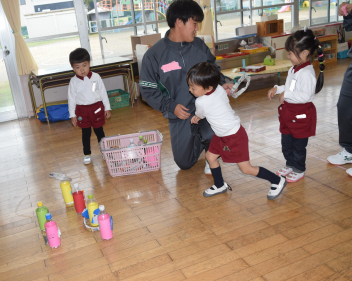 お兄さん、お姉さんの手作りおもちゃで遊びました。輪投げ、少し難しいかな投げ方を教えてもらうと「入ったよ」「見てて」「もう1回」何回も輪投げを楽しみました「作ってくれて、ありがとう」